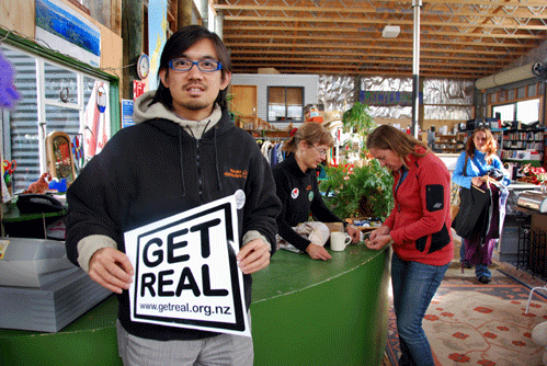 Project Team Member, Angus Ho is soft spoken but talks intensely about his project, Get Real.org.nz which aims at educating people and government in reducing and eventually eliminating plastic bag use at stores throughout the country. Ho has set up an info board and laptop where citizens can sign a petition for legislation on the subject. The following are a few Q&A from the Wastebusters newsletter, (Yes, they have a newsletter):