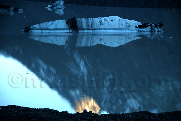 The Tasman Glacier regularly claves ice bergs but the evening we were there it was calm and each iceberg gave us a show of *“petreflections” of various sizes and patterns.