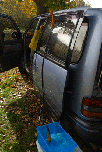 A shower nozzle with a suction cup holder for a side window attachment, and…(drum roll please) a 12-volt water pump with a cigarette lighter plug. Before this gadget, I used gravity by placing the hot water bag/shower on the roof or opened back door of the van. I will still use that system too, but after sticking the water pump in a bucket of hot water and turning on the nozzle, this outdoor shower is second to none. Interested readers can contact me. I’ll look more into the manufacturer’s address or maybe you can order directly from Mitre 10 in NZ.