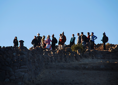 As I hiked from the island’s main port on the “near side” to stay with my old friend Jose on the east side, I climbed the trail as the sun was low in the late afternoon sky.  My first encounter with three of the large groups was on the summit of the Pacha Tata, one of two summits on the island with ceremonial ruins still in use today. As I approached the saddle at sunset I was shocked and dismayed to see three large separate groups of tourists headed for the summit from the island’s far side. Alongside the once quite path, were villagers of all ages, selling sweaters, assorted blankets and tourist goodies.