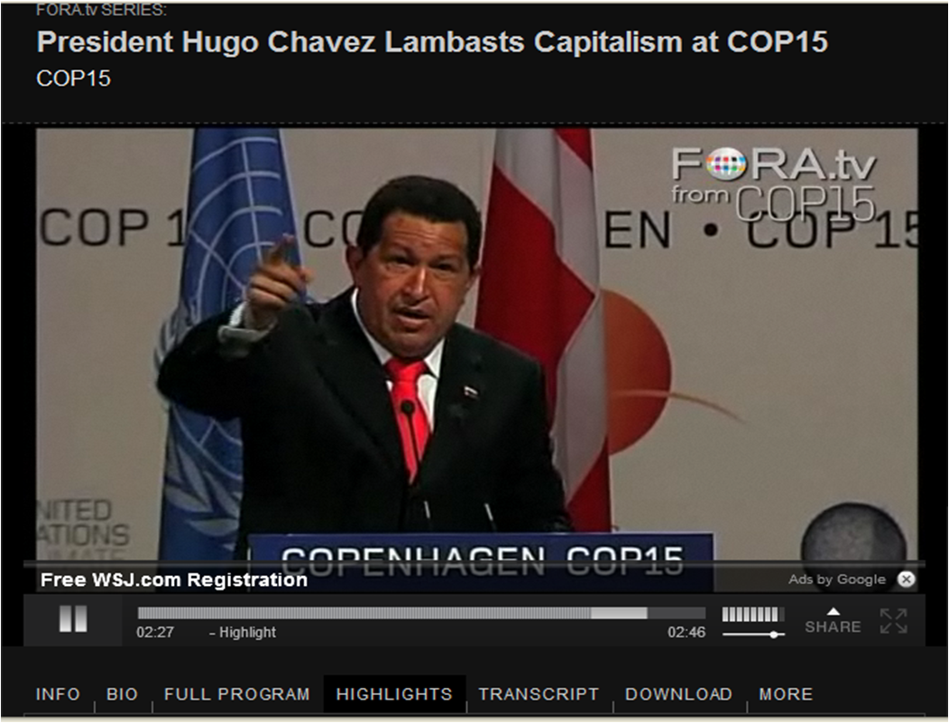 Venezuelan President Hugo Chavez links capitalism to the current state of global environmental degradation during an address on FORA.TV at the COP15 Climate Conference in Copenhagen.”A ghost is stalking the streets of Copenhagen…it’s capitalism, capitalism is that ghost,” says Chavez. He mentions in his address, a placard that demonstrators were holding up outside the conference building, which stated “Don’t change the climate, change the system”. He also stated, “If climate change were the banks, they would have saved it.”