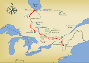 The map, drawn up by Johnny Clore, shows the full itinerary of Expedition 2012 from Lake Dunmore down Otter Creek to Lake Champlain, then down the Richelieu River to the St. Lawrence Seaway. From Montreal, we’ll head upstream on the Ottawa River for over three hundred miles and cut west for our resupply at Temagami by following the fabled “Trip In.” From there the route leads over a swift succession of smaller lakes and rivers to the Abitibi River, where we will restock and head for the bay at Moosonee. Resupply locations are indicated with yellow stars. Click the “Itinerary” tab on the left to get a more detailed look at our itinerary.