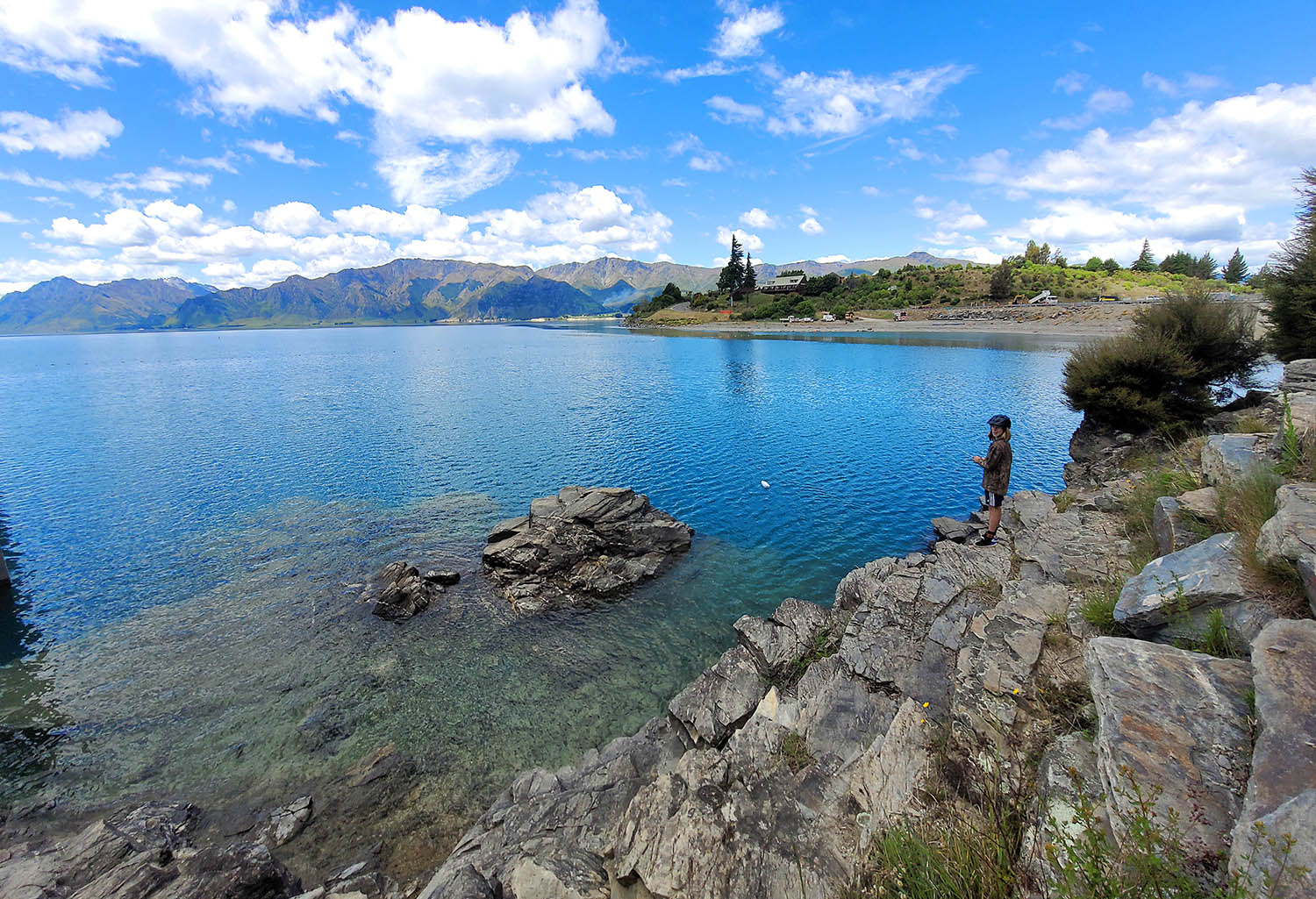 My son and I were down at the Lake Hawea waterfront today, at the dam, not far from Mountain Spirit, our home and retreat centre here on New Zealand’s South Island. We were fishing for salmon which have a habit of hanging around the dam this time of year in a vain attempt to swim downstream. That’s where the fishing is reportedly good, but we didn’t catch anything this day.