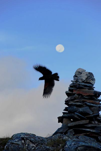 At the hut and just above, Keas, which are amazing Alpine parrots, seemed our constant companions. I figuring out when they would take off, and got some snaps of them in flight. One, at the hut, the other with Mt. Avalanche in the background just above the hut. They are very personable and curious creatures, if not troublesome. When we arrived at the hut on Day 1, the door to the was open, and the keas had made themselves at home, leaving the place a mess.