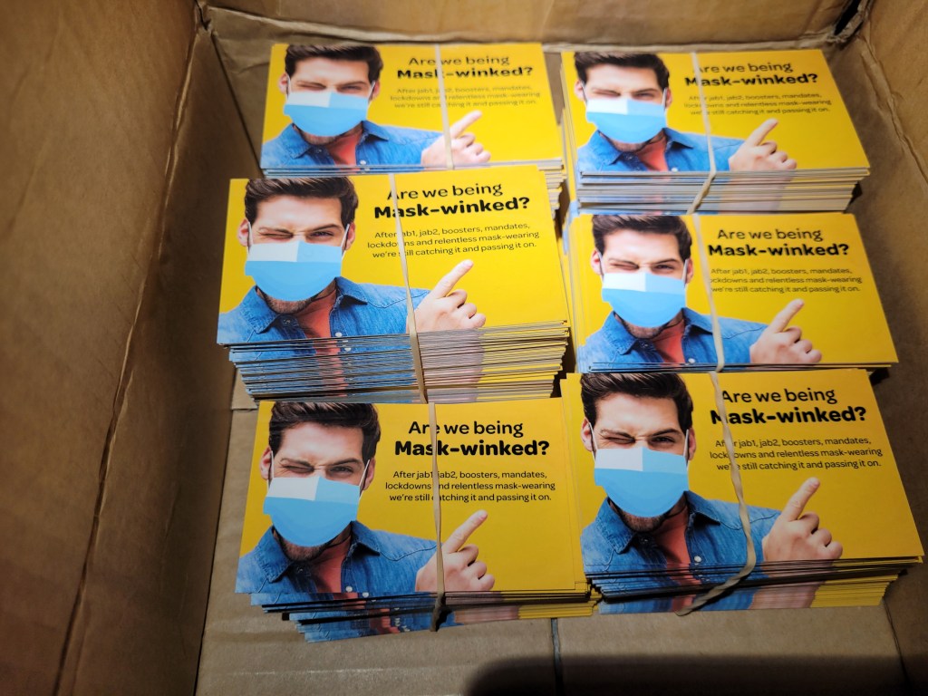 To Warrick Stubbs, Golden Bay, New Zealand: You are an inspiration. I’m hitting my stride even without the cards. As You know, I ran out of cards about 4 hours ago. Thanks for being the brainchild of these “mask-winked” cards. One lady on the last flight looked at me and said, “I hate wearing this mask”, and thanks to you, in not a soft voice, I replied, “You don’t have to. I haven’t worn my for a long time.” Adding, “and if enough of us stop wearing them, it’s game over. Later, once we disembarked, and in the ChCh airport lobby, I passed by her again. She smiled, (the mask was off) and gave me a thumbs up. Thanks Warrick, for all your tips and encouragement on how to reach out to those still finding their way to dumping the mask. I must say though, the Cambridge librarian and a driver on the public bus system were a bit hectic this arvo, all in a big flap. But both settled down once I smiled at them. These cards are part of our “media arsenal” to do an end-run around mainstream media’s narrative.